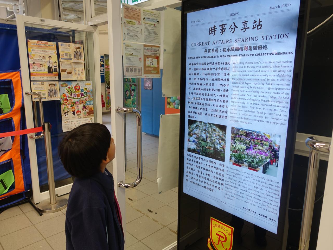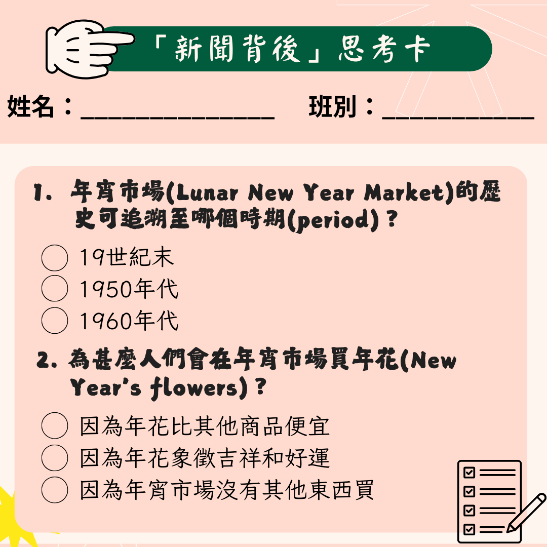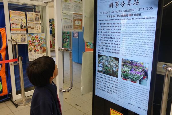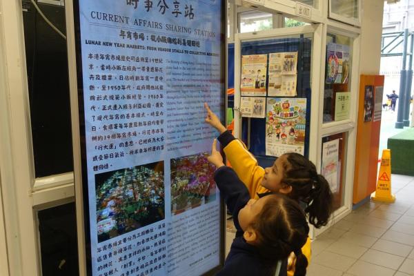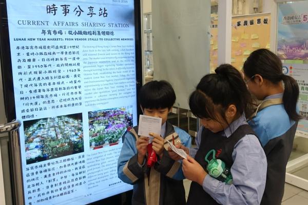 2026-03-09 為提升學生對時事的關注,本科於禮堂舉行「時事分享站」活動,3月內容為「年宵市場」。學生於小息期間觀看精選及貼近生活的新聞片段,並即時填寫「新聞背後」思考卡,就新聞內容作出理解、分析及個人反思。