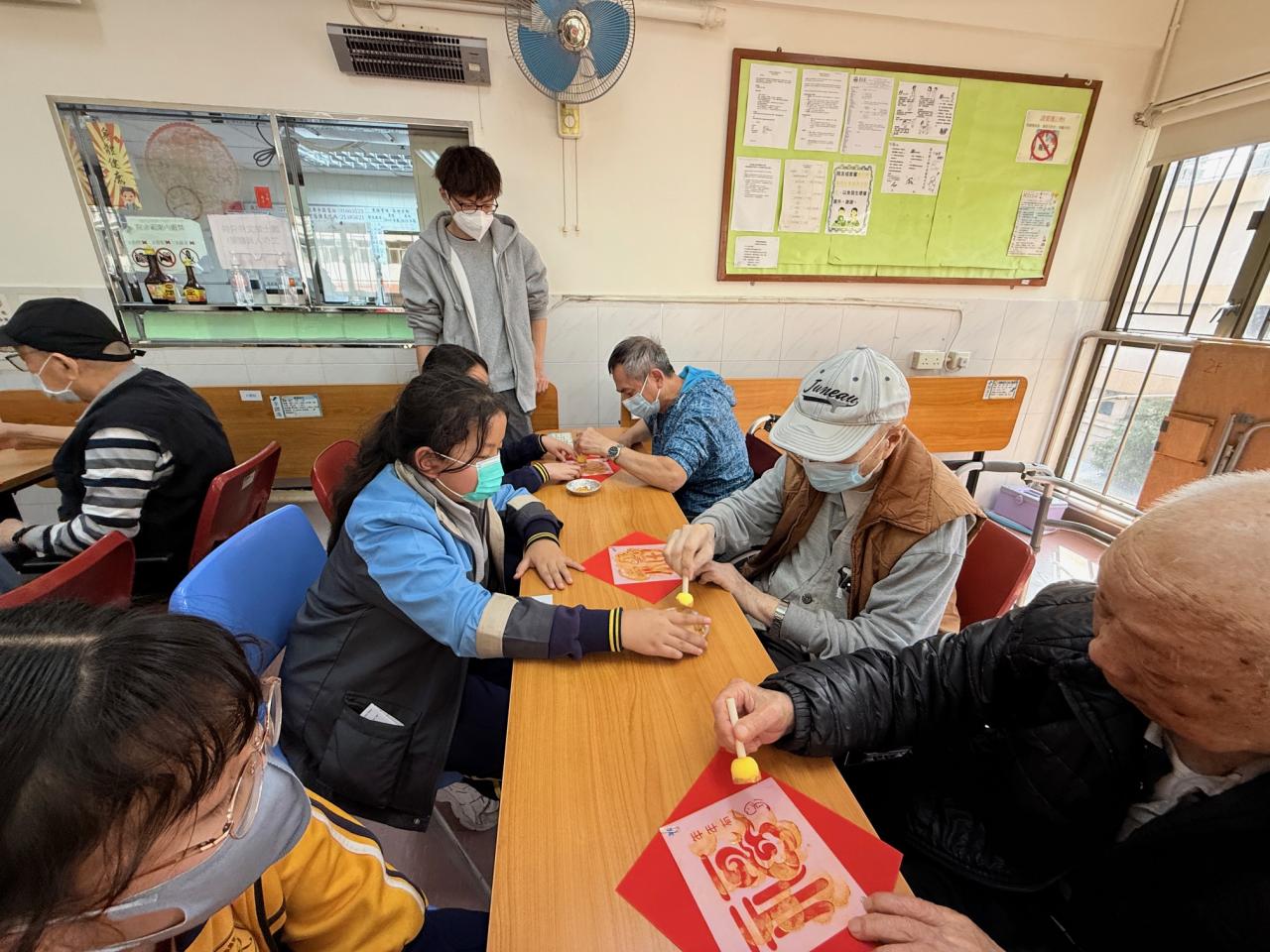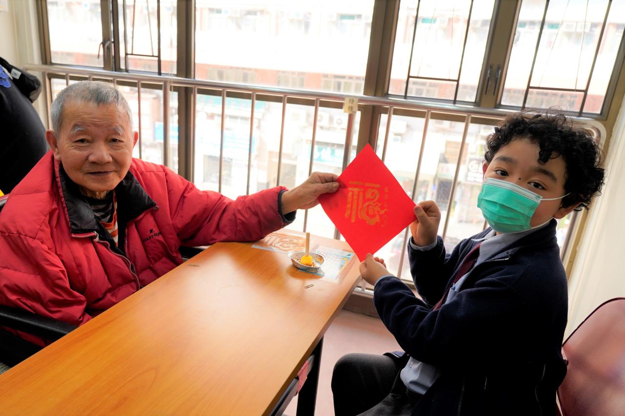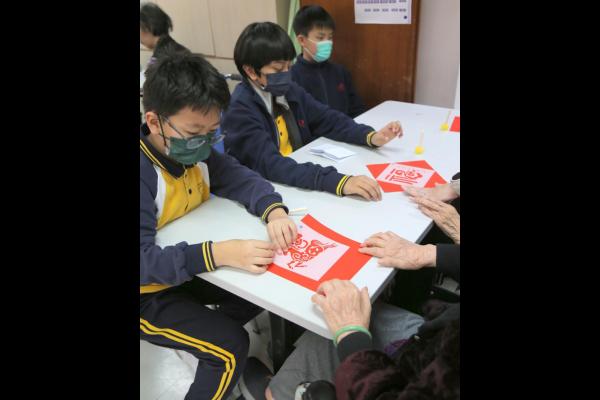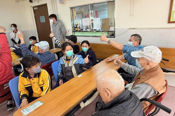 五年級學生到嗇色園可蔭護理安老院探訪長者。學生表演唱歌、和長者玩遊戲及做手工。