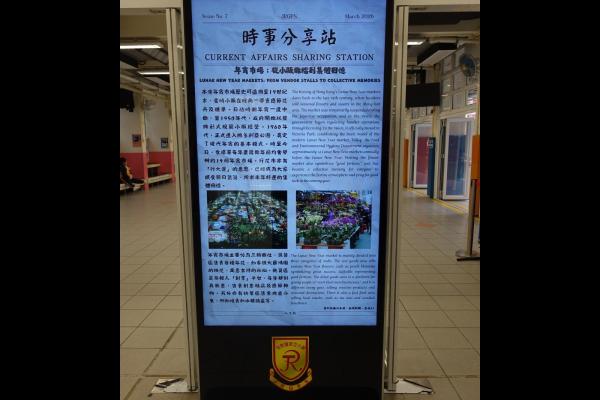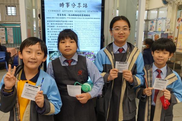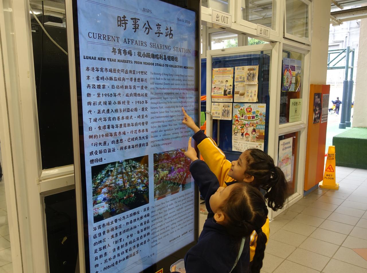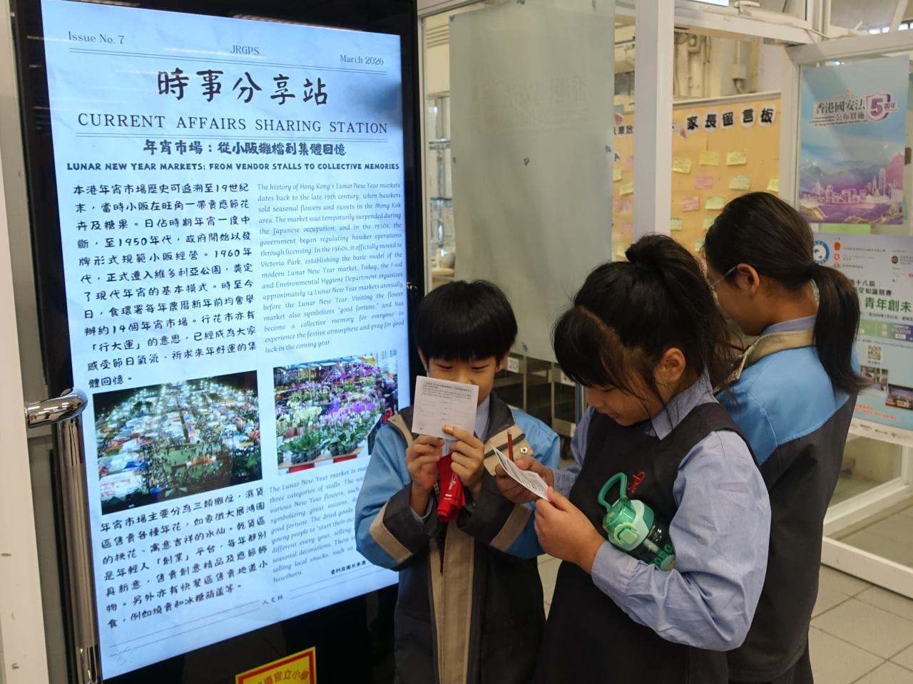 2026-03-09 為提升學生對時事的關注,本科於禮堂舉行「時事分享站」活動,3月內容為「年宵市場」。學生於小息期間觀看精選及貼近生活的新聞片段,並即時填寫「新聞背後」思考卡,就新聞內容作出理解、分析及個人反思。