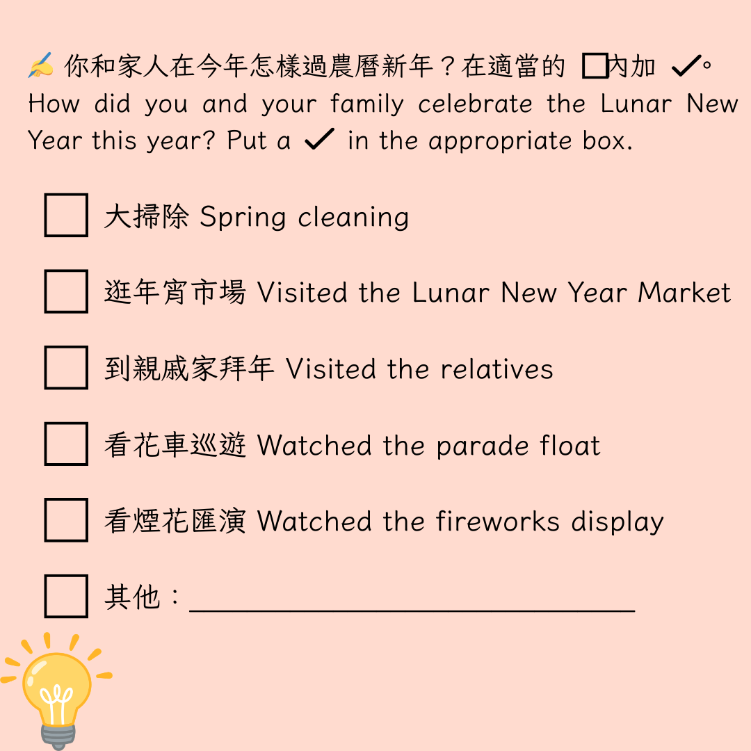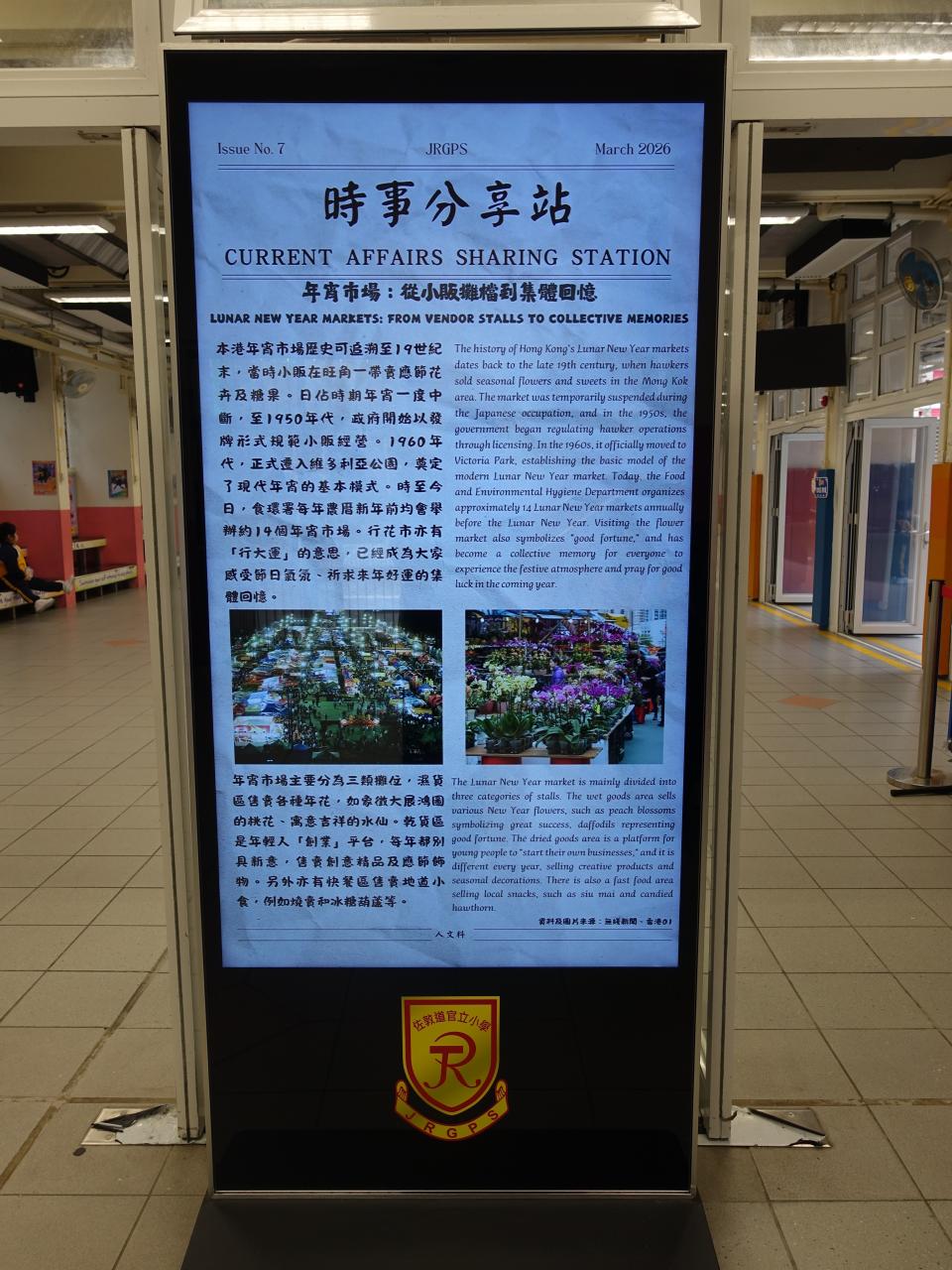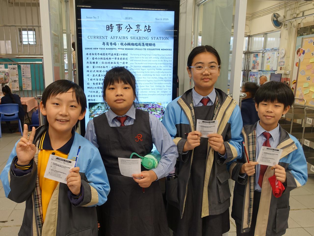 2026-03-09 為提升學生對時事的關注,本科於禮堂舉行「時事分享站」活動,3月內容為「年宵市場」。學生於小息期間觀看精選及貼近生活的新聞片段,並即時填寫「新聞背後」思考卡,就新聞內容作出理解、分析及個人反思。