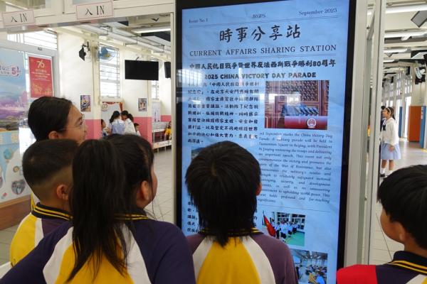 時事分享站 於地下大堂電子板展示貼近生活的新聞資訊,並擺放問答收集箱,鼓勵學生回應時事題目。科任老師定期與學生分享國家或香港相關的新聞。訓練「小小新聞報導員」,學生於課堂內或在午間廣播時段報導相關國家或香港的社會新聞。 主題式閱讀及探究活動科任老師推介與研習題目相關書目予學生進行網上閲讀,並配合問答比賽及閱讀獎勵計劃,促進學生自主閱讀。四年級與中文科進行跨學科活動,學生需閲讀有關香港今昔的資料並進行專題研習。2025-2026年度參觀活動P.1 消防局P.4 水知園、美荷樓校內比賽時事問答比賽